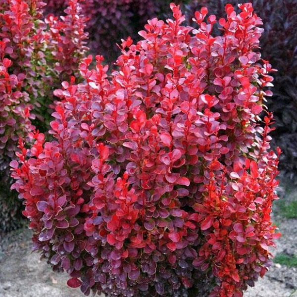 Компактный кустарник с плотной колоннообразной кроной высотой до 80 см, в диаметре 40, образованной пряморастущими крепкими побегами. Молодые листья достаточно крупные, имеют очень интенсивную винно- ярко-красную окраску, более старые приобретают темно-красный цвет.
